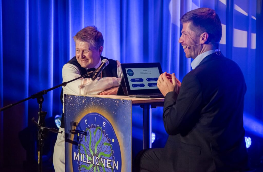 Pater Michael bei der „Millionenshow“ (li.) und die Gardemädchen im Sparkassensaal (Fotos Gartner/Wehrl)