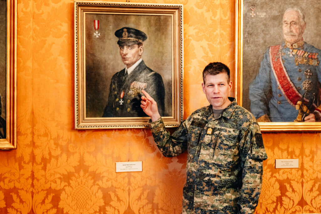 Philipp Ségur-Cabanac mit einem Gemälde seines Ur-Großonkels Gottfried Freiherr von Banfield (1890-1986) im Rittersaal der MilAk. Der „Adler von Triest” war Marineflieger im 1. Weltkrieg und wurde für 14 Luftsiege mit dem Maria Theresia-Orden ausgezeichnet. (Foto: Busy Shutters)