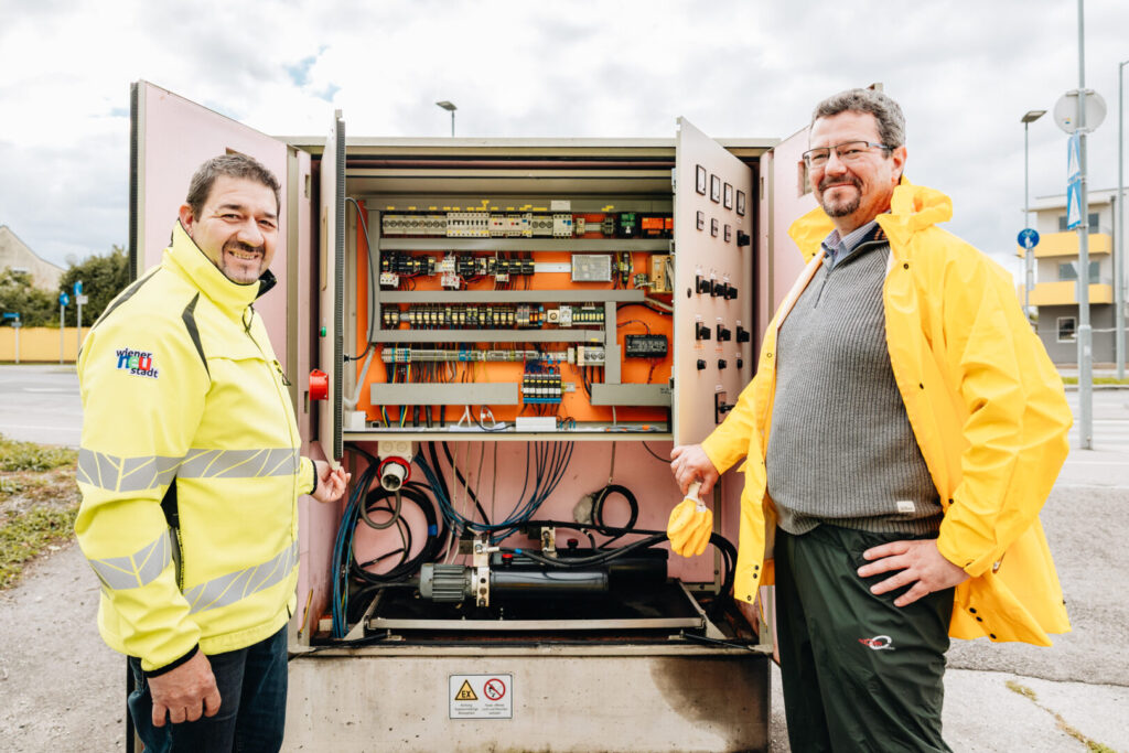 Manfred Holzgethan und Kanalmeister Gerhard Kabelik (li.) beim Kontrollkasten an der Oberfläche: In der Kanalisation steckt viel Technik und Elektronik. (Fotos: Busy Shutters)